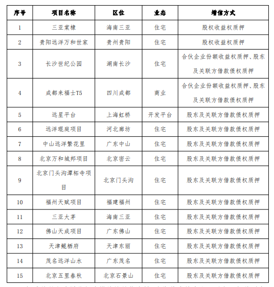 同时,远洋控股为本期债券增加增信保障措施,具体包括:(一)以三亚棠棣项目所属三亚棠棣庄园投资有限公司75%股权收益权提供质押担保;(二)以贵阳远洋万和世家项目所属贵阳远汇房地产开发有限公司100%股权收益权提供质押担保;(三)以长沙世纪公园项目所属芜湖远澈锦程投资中心(有限合伙)102,900万元的合伙企业份额收益权、股东及关联方借款债权提供质押担保;(四)以成都来福士T5项目所属芜湖远翔启捷投资管理中心(有限合伙)38,700万元合伙企业份额收益权、股东及关联方借款债权提供质押担保;(五)以北京颖煜企业管理咨询有限公司与发行人对重庆远洋红星企业发展有限公司等合计390,700万元股东及关联方借款债权提供质押担保;(六)以远洋琨庭项目所属廊坊市裕丰房地产开发有限公司享有221,900万元的股东及关联方借款债权提供质押担保;(七)以中山远洋繁花里项目所属中山市哈特贸易有限公司享有113,100万元的股东及关联方借款债权提供质押担保;(八)以北京万和城邦项目所属北京紫金长宁房地产开发有限责任公司享有68,000万元的股东及关联方借款债权提供质押担保;(九)以北京门头沟潭柘寺项目所属北京潭柘兴业房地产开发有限公司享有65,450万元的股东及关联方借款债权提供质押担保;(十)以福州天赋项目所属福州远榕兴置业有限公司享有44,300万元的股东及关联方借款债权提供质押担保;(十一)以三亚大茅项目所属远洋(海南)农业农村发展有限公司享有58,300万元的股东及关联方借款债权提供质押担保;(十二)以佛山天成项目所属佛山市展翰房地产开发有限公司享有60,000万元的股东及关联方借款债权提供质押担保;(十三)以天津鲲栖府项目所属天津星华城置业有限公司享有40,000万元的股东及关联方借款债权提供质押担保;(十四)以茂名远洋山水项目所属茂名市锦绣河山房地产开发有限公司享有29,600万元的股东及关联方借款债权提供质押担保;(十五)以北京五里春秋项目所属北京景西房地产开发有限公司享有24,000万元的股东及关联方借款债权提供质押担保。