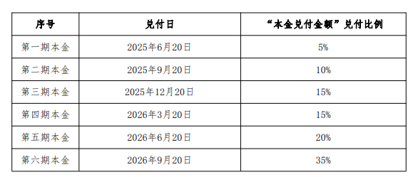 议案显示,本期债券本金兑付时间调整为自2025年6月20日起至2026年9月20日(以下简称“兑付日调整期间”),即展期2.5年。自2025年6月起,本期债券的本金兑付金额开始分期兑付,明年分三期合计兑付30%本金,2026年兑付剩余70%本金。