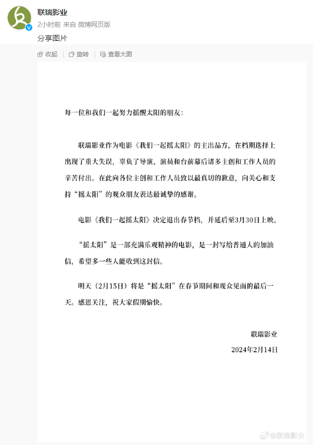 2月14日,联瑞影业在微博表示,档期选择出现重大失误,《我们一起摇太阳》将退出春节档,并延后至3月30日上映。