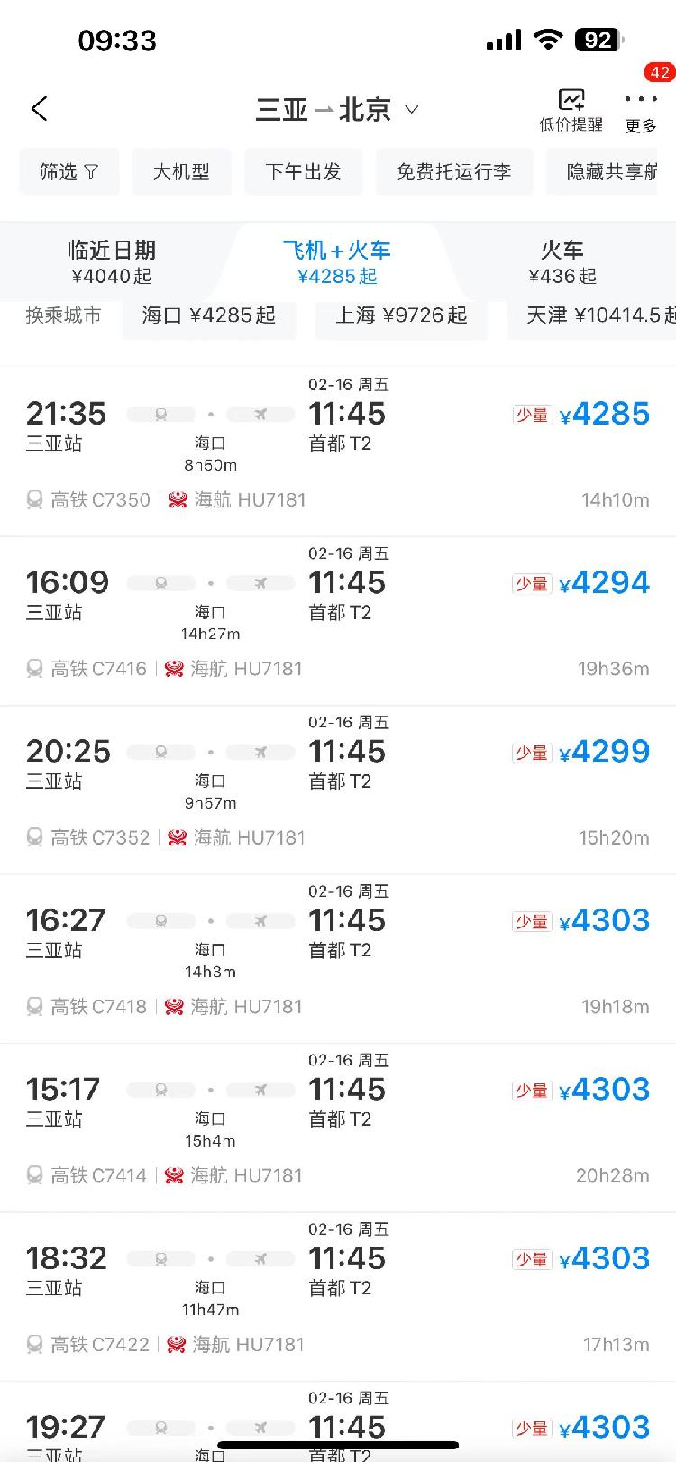 记者从携程了解到,它们为用户提供了临近方案,即从三亚飞至目的地附近更便宜的地方,再坐高铁返程。如三亚2月16、17日直飞成都,价格在九千元以上,但如选择从三亚高铁至海口,再从海口直飞成都,价格要便宜两三千元。2月17日,游客从三亚飞天津仅4000多元,再从天津高铁至北京,能比三亚飞北京便宜六七千块钱。